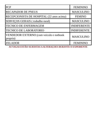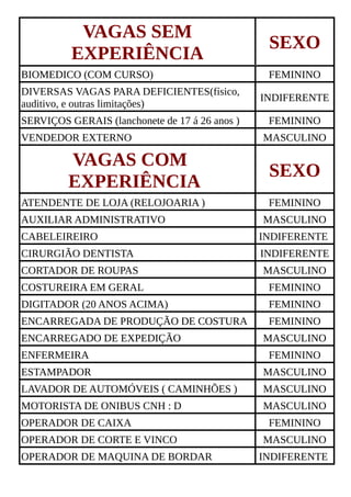 O documento lista várias vagas de emprego disponíveis, divididas entre vagas sem experiência e vagas com experiência. Nas vagas sem experiência são listadas posições para biólogo, serviços gerais e vendedor externo. Nas vagas com experiência são listadas posições como atendente de loja, auxiliar administrativo, cabeleireiro, dentista e outras para costureira, digitador, enfermeira e motorista de ônibus.