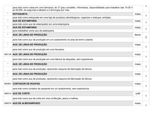 O documento lista várias vagas de emprego, principalmente na área da confecção, requerendo experiência em funções como costureira, modelista, estilista e cortador. Há também vagas para auxiliar de escritório e balanceiro em usina de Jussara. Interessados devem comparecer na Agência do Trabalhador com documentos.