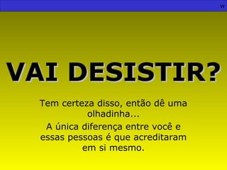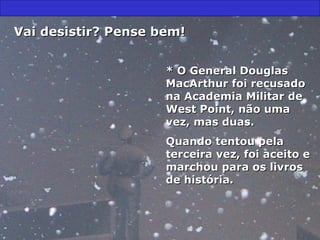 O documento lista exemplos de pessoas que tiveram sucesso apesar de fracassos iniciais ou dificuldades, como Douglas MacArthur que foi rejeitado duas vezes na academia militar, mas depois se tornou um general famoso, e Albert Einstein que foi considerado lento na escola mas se tornou um grande físico. O documento incentiva o leitor a não desistir mesmo quando enfrentar obstáculos.