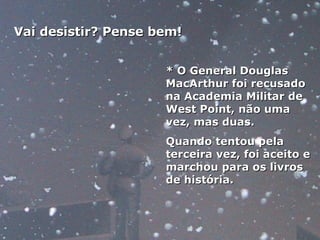 Grandes figuras históricas como Douglas MacArthur, Michael Jordan, Winston Churchill e Albert Einstein tiveram dificuldades e fracassos iniciais, mas perseveraram e se tornaram bem-sucedidos; Thomas Edison levou 2000 tentativas para inventar a lâmpada incandescente, demonstrando que o fracasso não é o fim, mas parte do processo de aprendizagem.