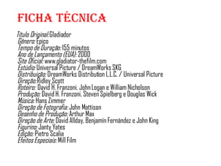 O filme Gladiador é um épico histórico ambientado no ano 180 d.C. no Império Romano. Conta a história do general Máximo, que após ver seu imperador assassinado e sua família morta, torna-se um gladiador para se vingar. Ele luta bravamente no Coliseu até enfrentar e derrotar seu maior rival para assumir o poder.