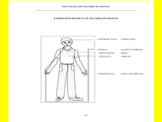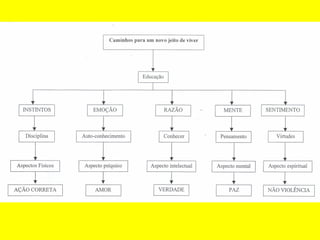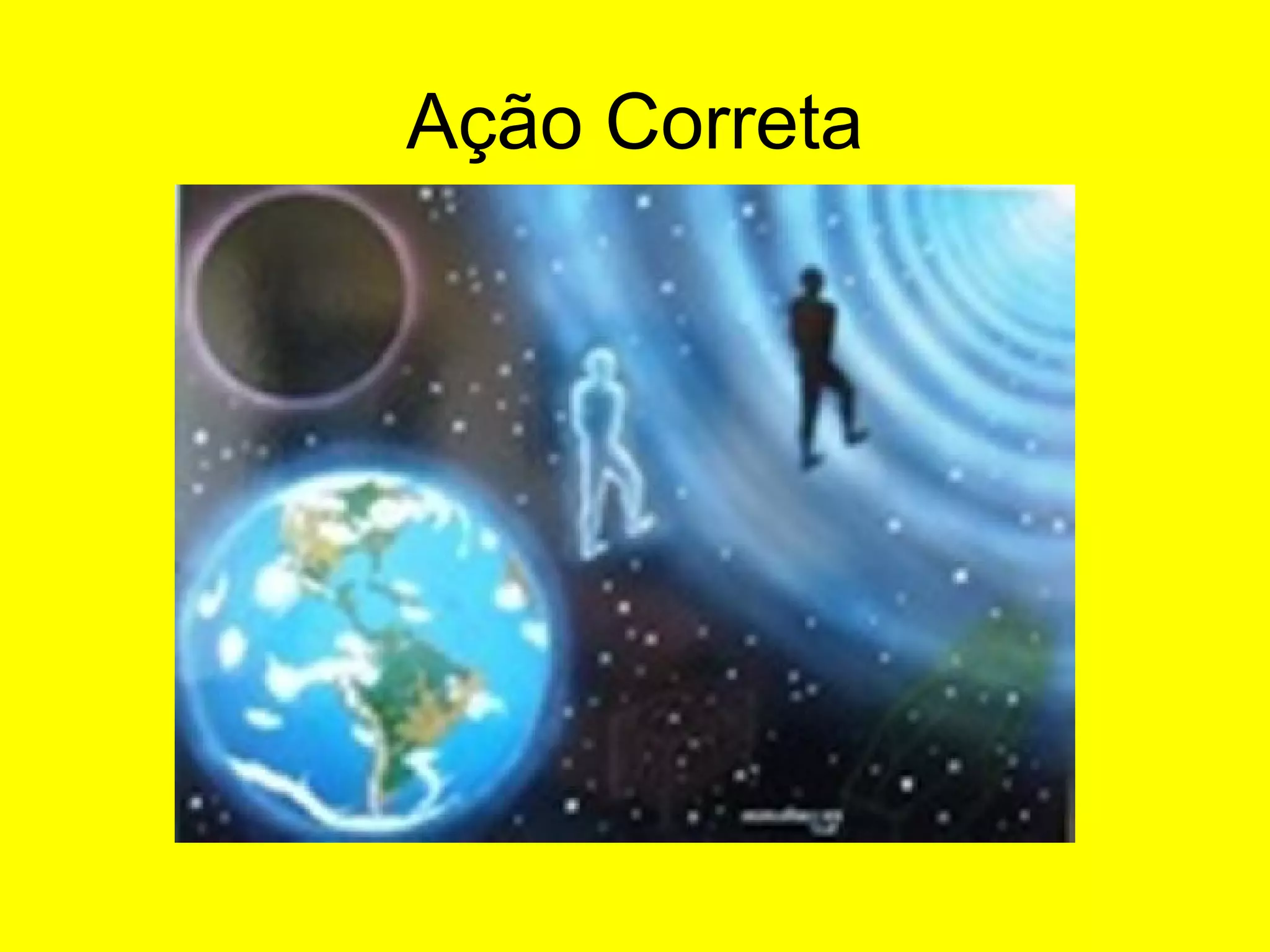 O documento discute a importância da ação correta, que surge do aprimoramento do caráter através da busca contínua de si mesmo e da conexão com a consciência superior. A ação correta pressupõe valores como dever, ética e responsabilidade, diferindo da ação certa que mantém a mente presa aos julgamentos. O documento também discute a educação em valores humanos como verdade, retidão, paz, amor e não-violência.