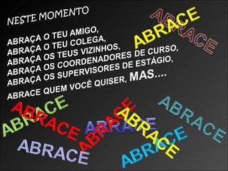 O documento discute a importância dos abraços como forma essencial de contato físico que beneficia a saúde emocional e física, aliviando dor e ansiedade. Um episódio de duas irmãs gêmeas ilustra o poder reconfortante do abraço, que pode até salvar vidas. Conclui incentivando as pessoas a abraçarem seus entes queridos, destacando o valor do contato humano.