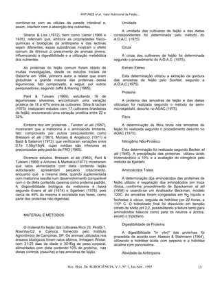 Este documento apresenta os resultados de um estudo sobre o valor nutricional e fatores antinutricionais de quatro cultivares de feijão comumente encontradas no Brasil. Os resultados mostraram que esses feijões tinham altos níveis de fatores antinutricionais que causaram 100% de mortalidade em ratos alimentados com feijão cru. Os valores nutricionais variaram entre as cultivares, com o feijão Rico 23 apresentando os melhores resultados para eficiência protéica e valor biológico.
