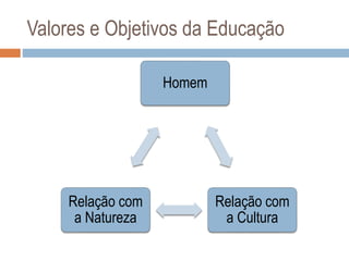 O documento discute os valores e objetivos da educação. Primeiro, destaca a importância de refletir sobre os valores para entender os problemas educacionais. Em seguida, ressalta a necessidade de definir os objetivos de qualquer ação educacional proposta para resolver esses problemas. Por fim, enfatiza a complexidade do tema valores e como eles estão presentes na experiência humana.