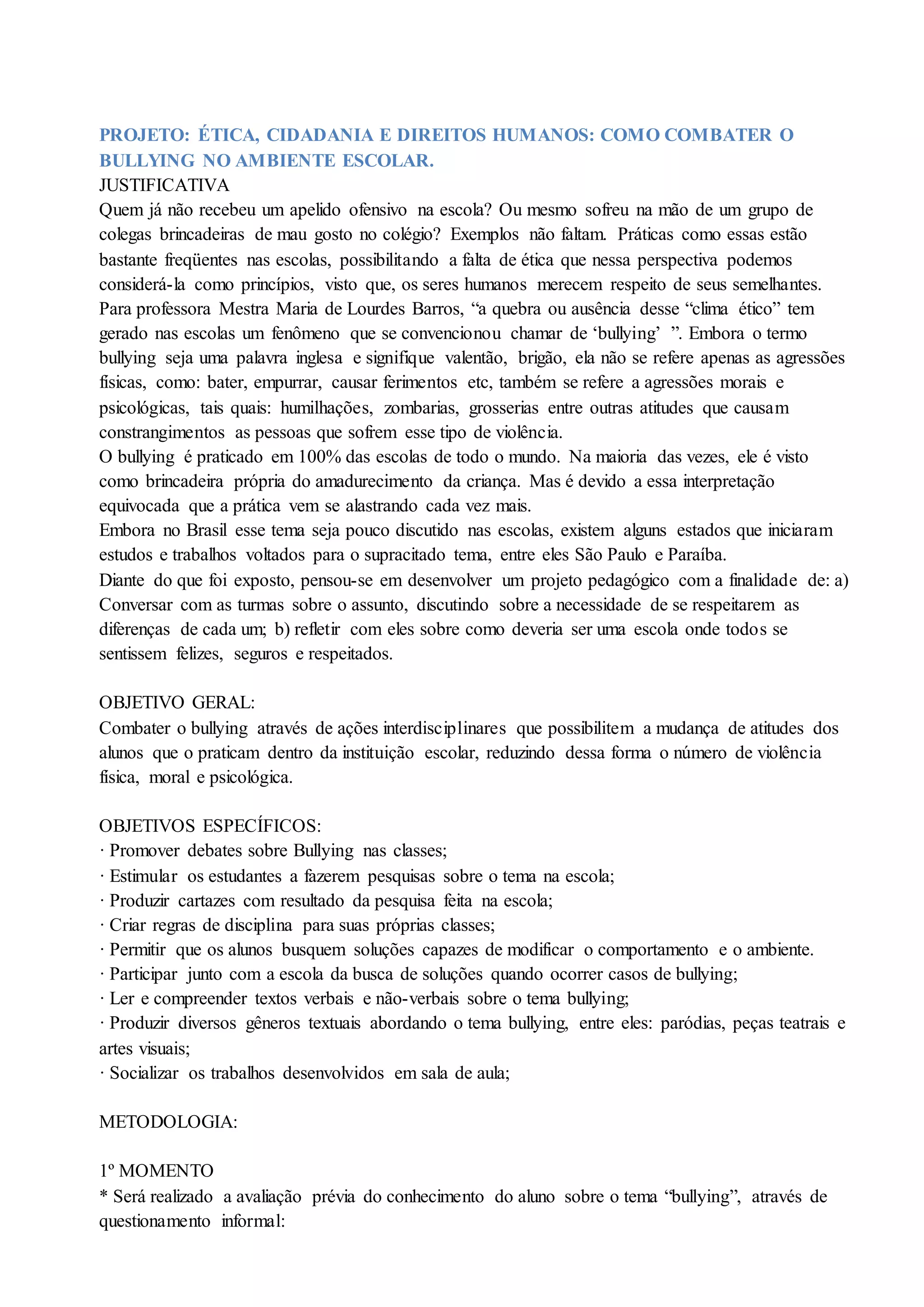 Este projeto visa combater o bullying nas escolas através de debates, pesquisas e produção de materiais sobre o tema. O projeto promoverá discussões sobre respeito às diferenças e como criar um ambiente escolar seguro e acolhedor para todos. As atividades serão interdisciplinares e envolverão a comunidade escolar.
