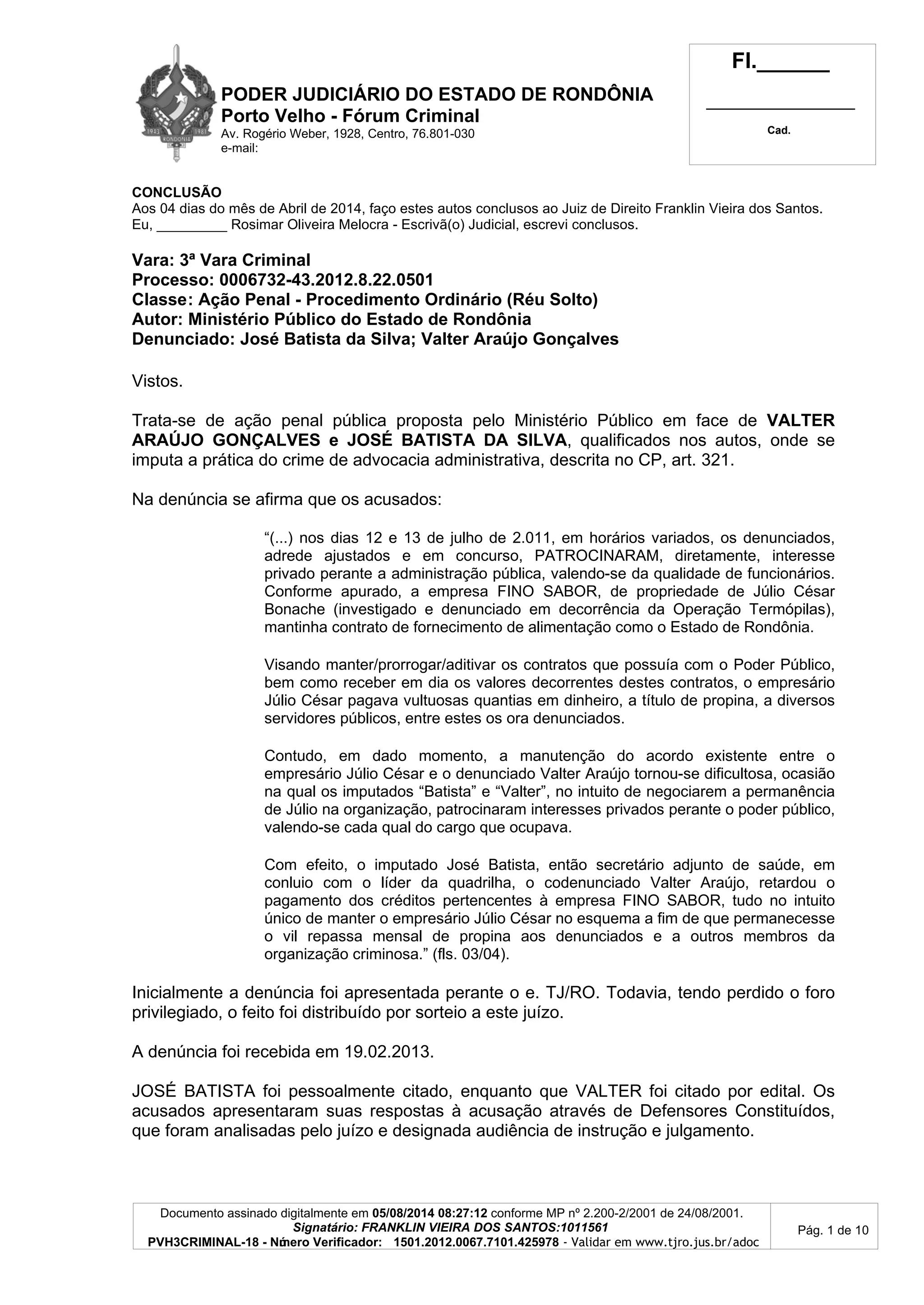 Este documento descreve um processo judicial contra dois acusados de advocacia administrativa. A denúncia afirma que os acusados atuaram para manter contratos de fornecimento de alimentação de uma empresa com o estado, atrasando pagamentos. Após analisar preliminares e o mérito do caso, o juiz rejeita as preliminares e considera comprovada a acusação, condenando os réus.