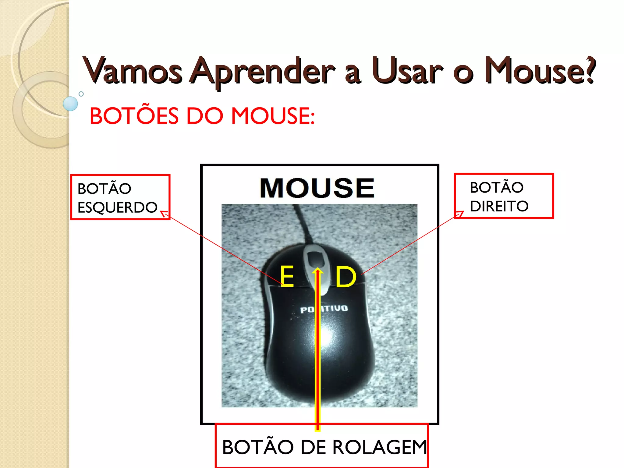 Vamos Aprender aUsar o Mouse? BOTÕES DO MOUSE: E D BOTÃO ESQUERDO BOTÃO DIREITO BOTÃO DE ROLAGEM