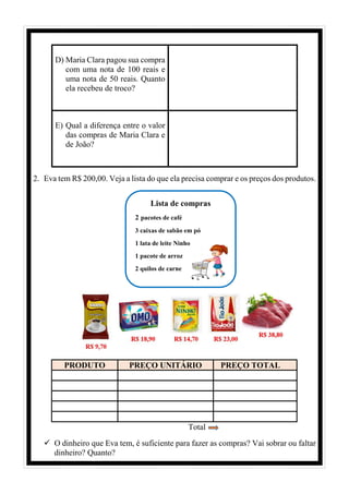 O documento descreve duas situações de compras escolares e de mercado. Na primeira, Maria Clara comprou materiais escolares por R$45 e João comprou seus itens por R$60, com uma diferença de R$15 entre as compras. Na segunda situação, Eva tem R$200 para fazer compras de mercado, mas a lista total de preços não é fornecida para determinar se sobrará ou faltará dinheiro.