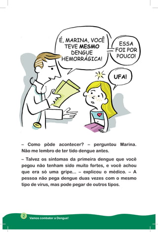 O documento narra a história de Marina e seus amigos, que aprendem sobre a dengue e como combatê-la após uma conversa com um médico. Eles decidem investigar e entrevistam um mosquito da dengue, que explica como a doença é transmitida e como evitar seu avanço. A narrativa enfatiza a importância da eliminação de criadouros do mosquito e a conscientização da população para prevenir a dengue.