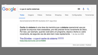 O documento aborda a importância do cache em sistemas de desenvolvimento, destacando diferentes tipos de cache e suas funções no backend e frontend. Estratégias para gerenciar o cache, incluindo invalidação e cuidados em sistemas distribuídos, são discutidas. A eficácia do cache na velocidade de carregamento e na redução de recursos de servidor também é enfatizada.