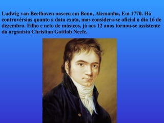 Ludwig van Beethoven nasceu em 1770 na Alemanha e foi um importante compositor clássico e romântico. Ele compôs 9 sinfonias, 32 sonatas para piano e outros trabalhos influentes. Sua audição começou a falhar em 1802, mas isso não o impediu de continuar compondo obras-primas.