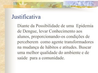 O documento descreve um projeto educativo sobre dengue para alunos do 3o ano do ensino fundamental. O projeto tem como objetivo conscientizar estudantes e comunidade sobre a prevenção da dengue através de atividades como debates, teatro e murais. Ele explica sobre o mosquito Aedes aegypti, sintomas da dengue e como evitar a doença.
