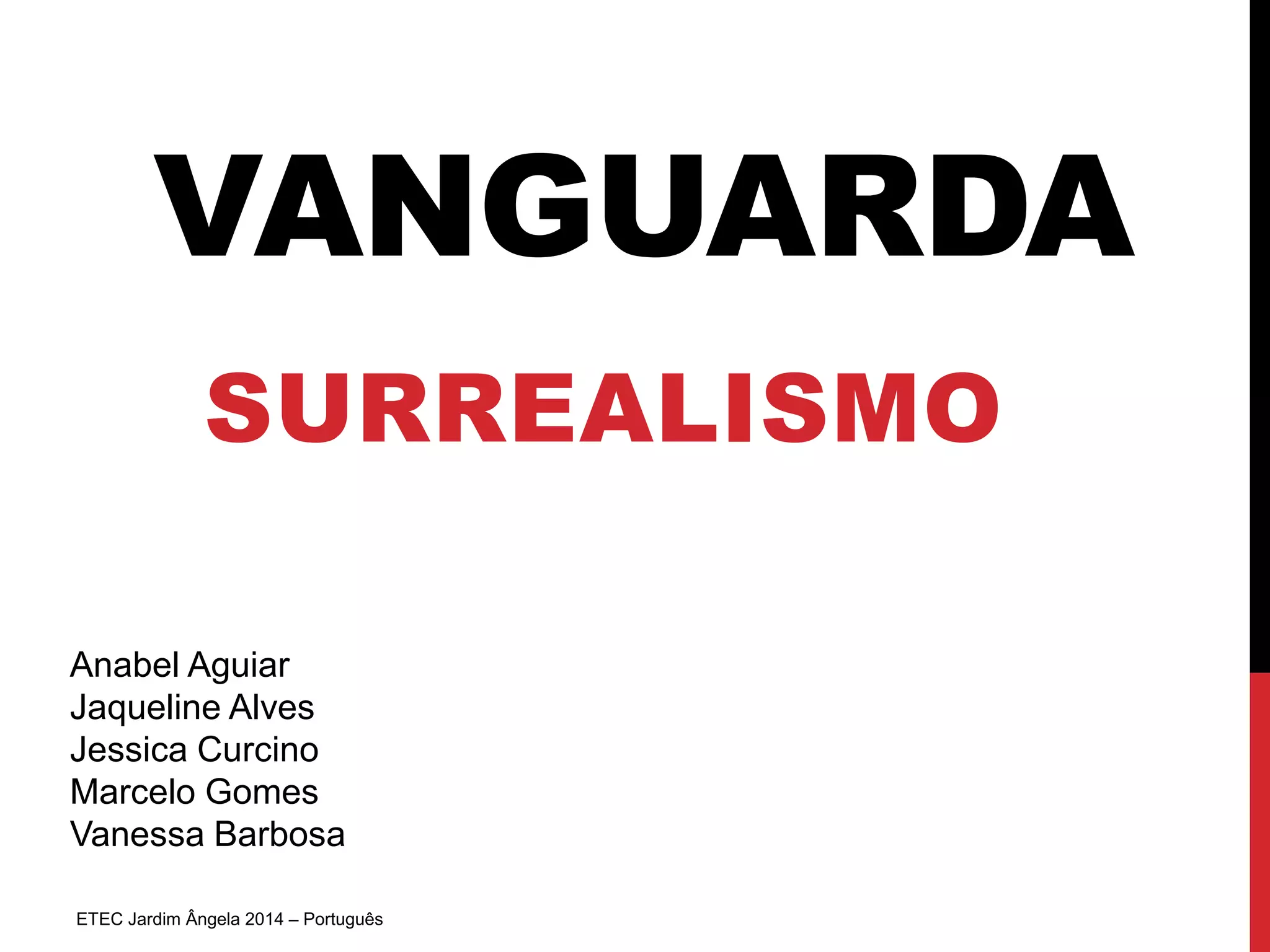 O documento descreve o movimento surrealista, incluindo seu início na França na década de 1920 sob a influência de Freud, seus principais artistas como Salvador Dalí, Joan Miró e Max Ernst, e sua ênfase na imaginação, sonhos e inconsciente ao rejeitar valores burgueses.