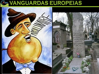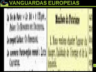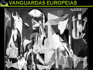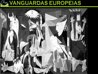 O documento descreve vários movimentos artísticos de vanguarda do início do século XX, incluindo o Futurismo, Cubismo, Expressionismo, Dadaísmo e Surrealismo. O Futurismo italiano exaltava a vida moderna e a velocidade, enquanto o Cubismo buscava representar formas e volumes de maneira geométrica. O Expressionismo alemão procurava expressar emoções e visões pessimistas por meio de formas exageradas.