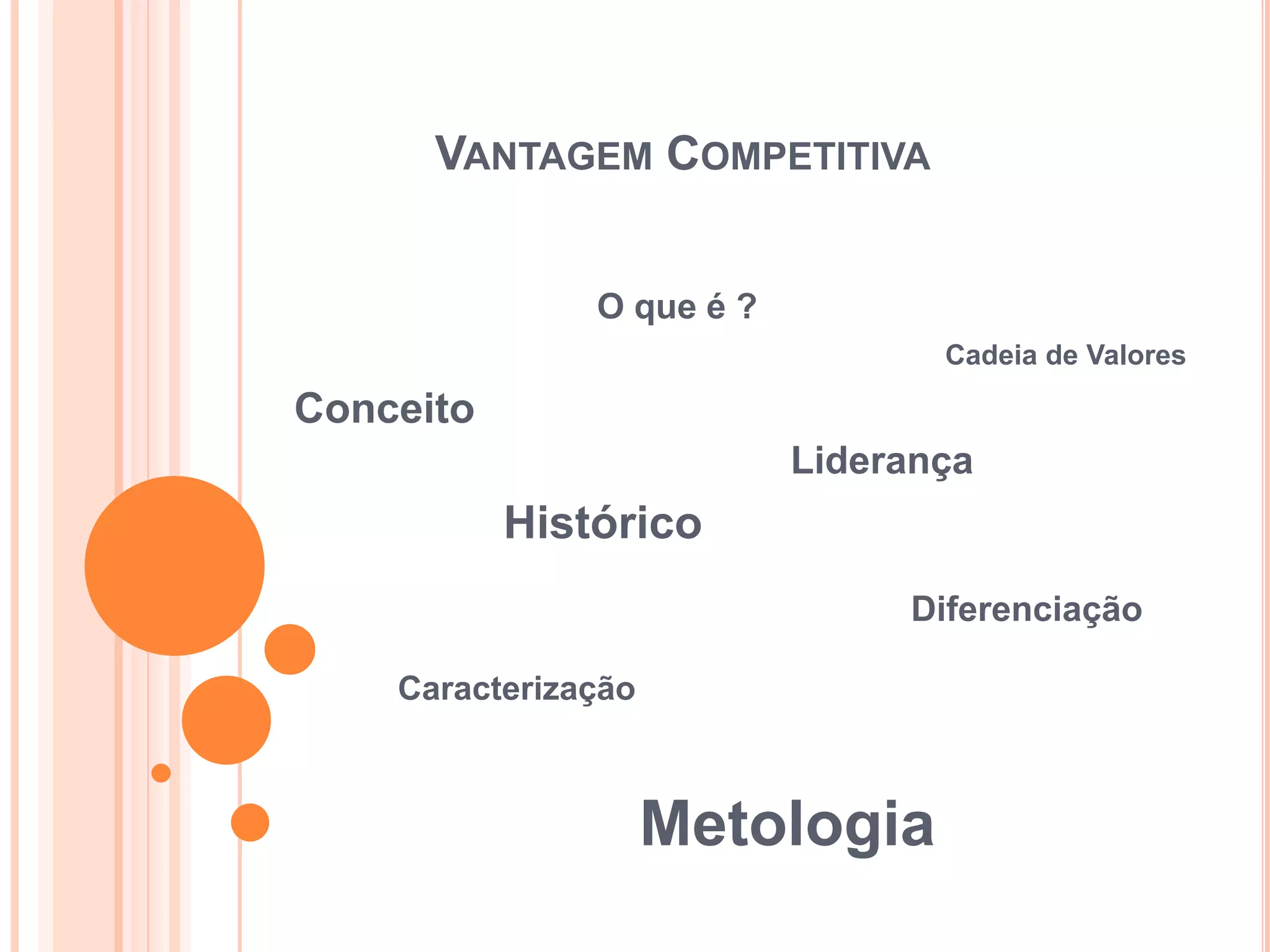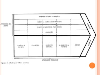 O documento discute o conceito de vantagem competitiva desenvolvido por Michael Porter, definindo-o como características que permitem uma empresa oferecer mais valor aos clientes em comparação à concorrência. Apresenta as duas fontes genéricas de vantagem competitiva: liderança de custo e diferenciação, e explica a importância da cadeia de valores na análise das fontes de vantagem competitiva de uma empresa.