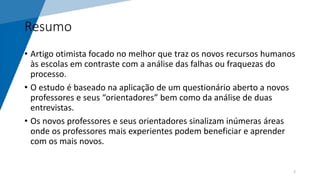 Este estudo norueguês investigou como os novos professores podem ser vistos como um recurso nas escolas e o que os professores experientes podem aprender com eles. Os resultados mostraram que, embora os novos professores trouxessem novas ideias, entusiasmo e compreensão dos alunos, eles raramente eram utilizados como tal. O estudo recomenda que as escolas aproveitem melhor as contribuições dos novos professores e vejam a sua chegada como uma oportunidade de desenvolvimento para toda a escola.