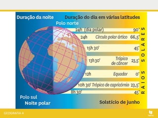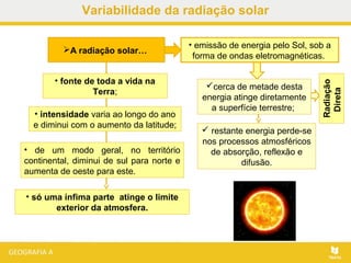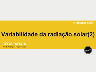 O documento discute a variabilidade da radiação solar recebida na Terra, explicando que a quantidade de energia solar varia de acordo com a latitude, estação do ano e inclinação dos raios solares. A radiação é maior nas regiões próximas do equador e no verão do hemisfério norte, quando os raios solares atingem Portugal com menor obliquidade.
