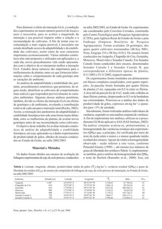 Este documento apresenta um resumo de métodos estatísticos para estudar a adaptabilidade e estabilidade fenotípica em soja. Foram avaliados dados de produtividade de grãos de 28 genótipos de soja testados em 7 locais no estado de Goiás. Vários métodos estatísticos foram aplicados, incluindo métodos tradicionais, de regressão, AMMI e outros. Observou-se forte associação entre alguns métodos, como Plaisted & Peterson e Wricke, e Annicchiarico e Lin &