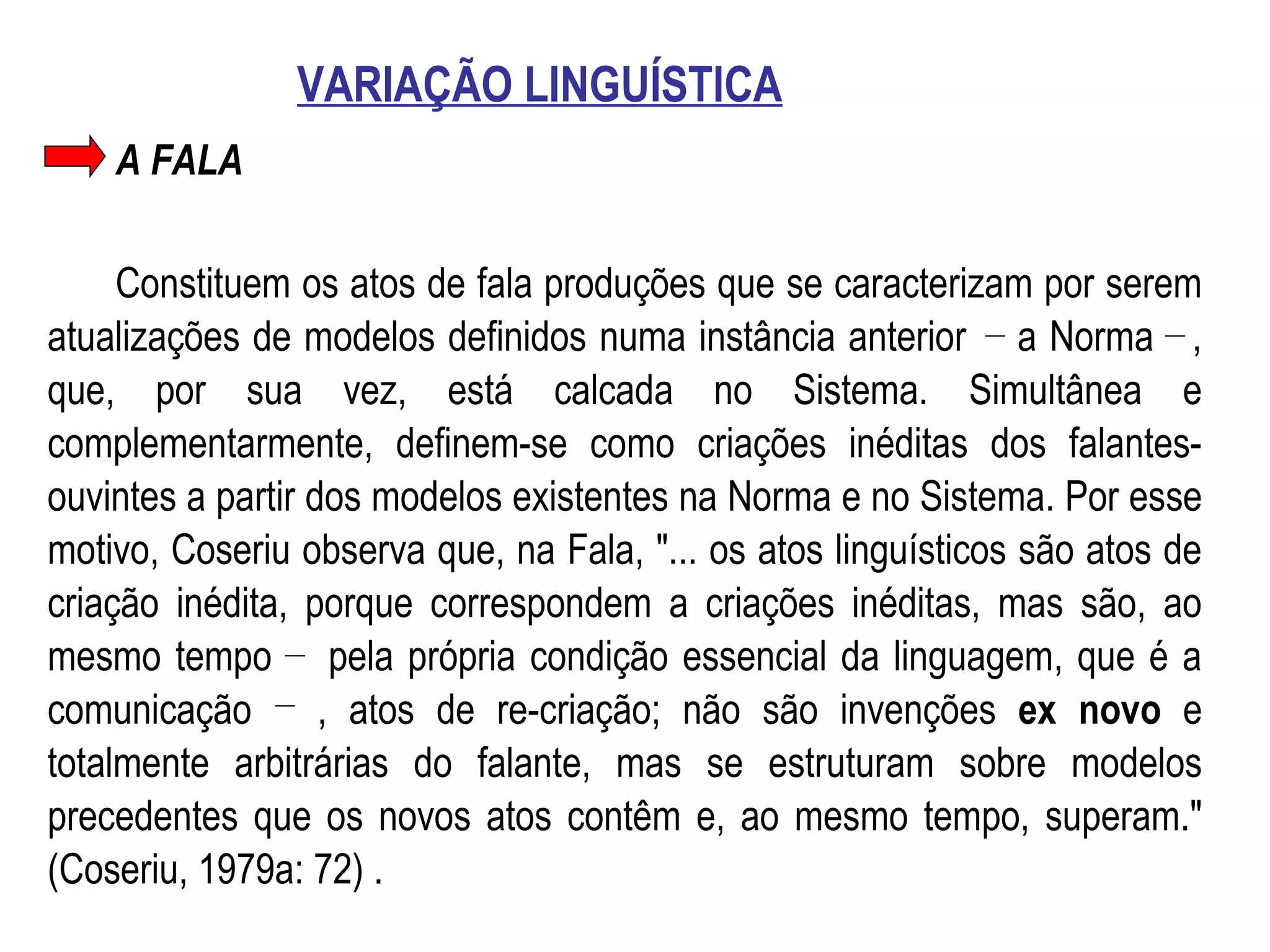 O documento discute a variação linguística na fala, norma e sistema. 1) Na fala há repetição de modelos anteriores e criações dos falantes; 2) A norma representa as estruturas linguísticas de uma comunidade e varia de acordo com fatores como espaço, classe social e idade; 3) O sistema contém apenas as invariantes funcionais da língua.