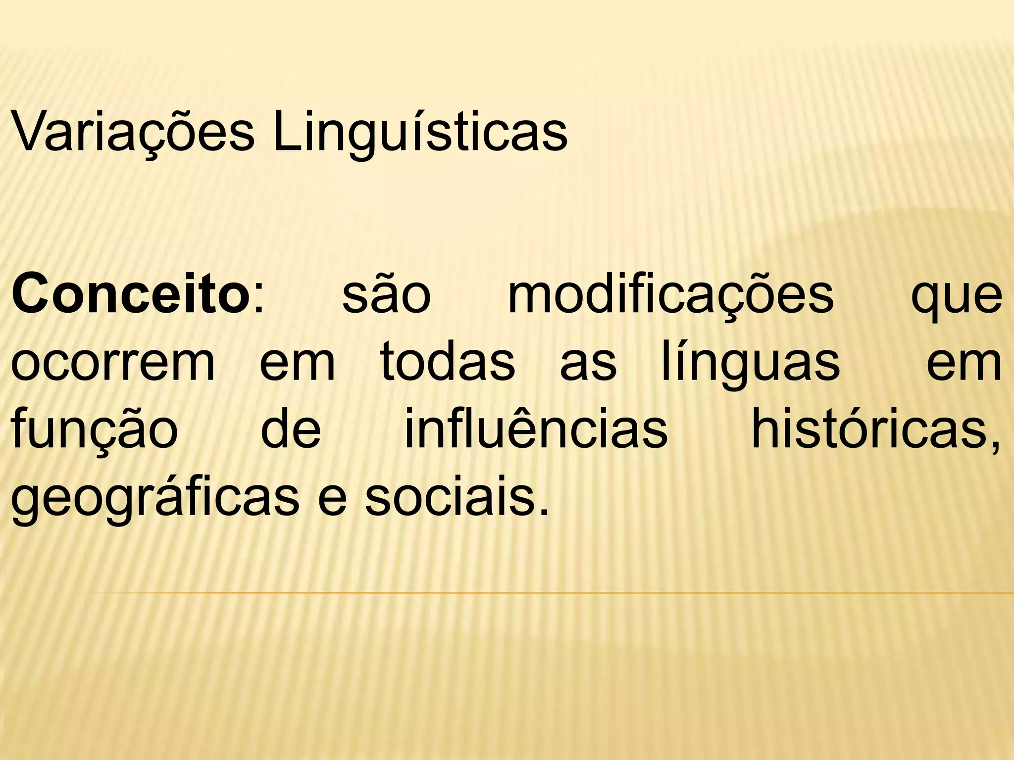 O documento discute as variações linguísticas, que ocorrem devido a fatores históricos, geográficos e sociais. Essas variações incluem diferenças de vocabulário, pronúncia, morfologia e sintaxe e podem variar de acordo com a região ou situação social. Exemplos de variações regionais incluem dialetos mineiro e cuiabano.