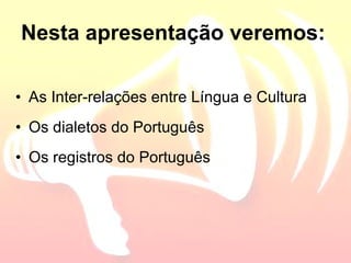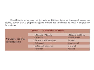 Este documento discute variantes linguísticas como dialetos e registros. Apresenta que dialetos variam de acordo com fatores como localização geográfica, idade, gênero e classe social. Já os registros variam de acordo com o grau de formalismo, se é falado ou escrito, e dimensões de sintonia como status social, tecnicidade, cortesia e norma. O documento também discute a relação entre língua e cultura.