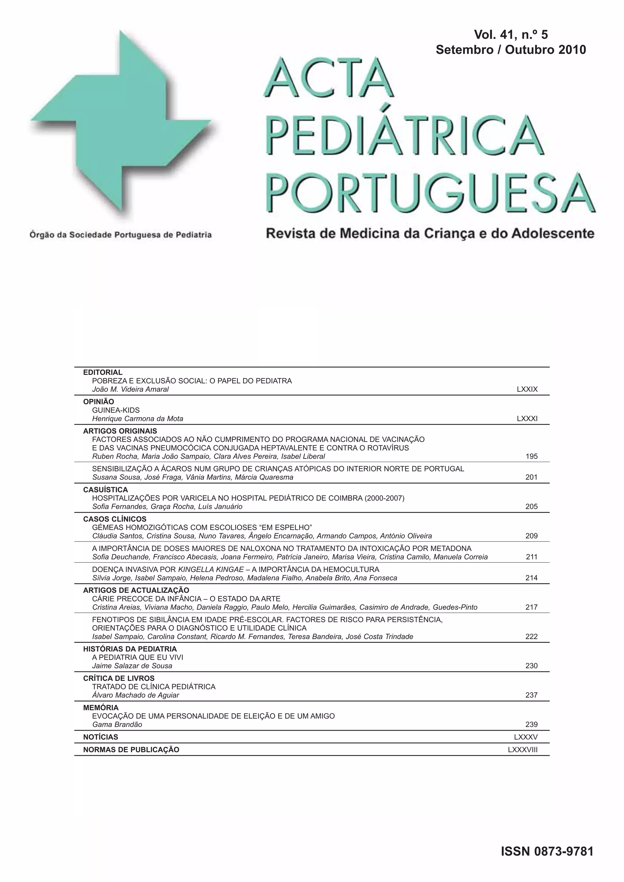 Este documento resume a edição de setembro/outubro 2010 da revista Acta Pediátrica Portuguesa. Apresenta um editorial sobre a pobreza e exclusão social e seu impacto na saúde das crianças, bem como artigos originais, casos clínicos, artigos de atualização e histórias sobre pediatria.