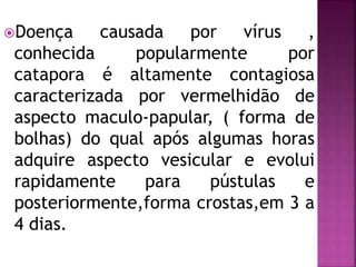 A catapora é uma doença viral altamente contagiosa caracterizada por erupções na pele que evoluem para bolhas e crostas. É transmitida por contato direto ou indireto e, embora benigna em crianças, pode ser mais grave em adultos. A vacina é a melhor forma de prevenção, embora não esteja disponível no sistema público de saúde.