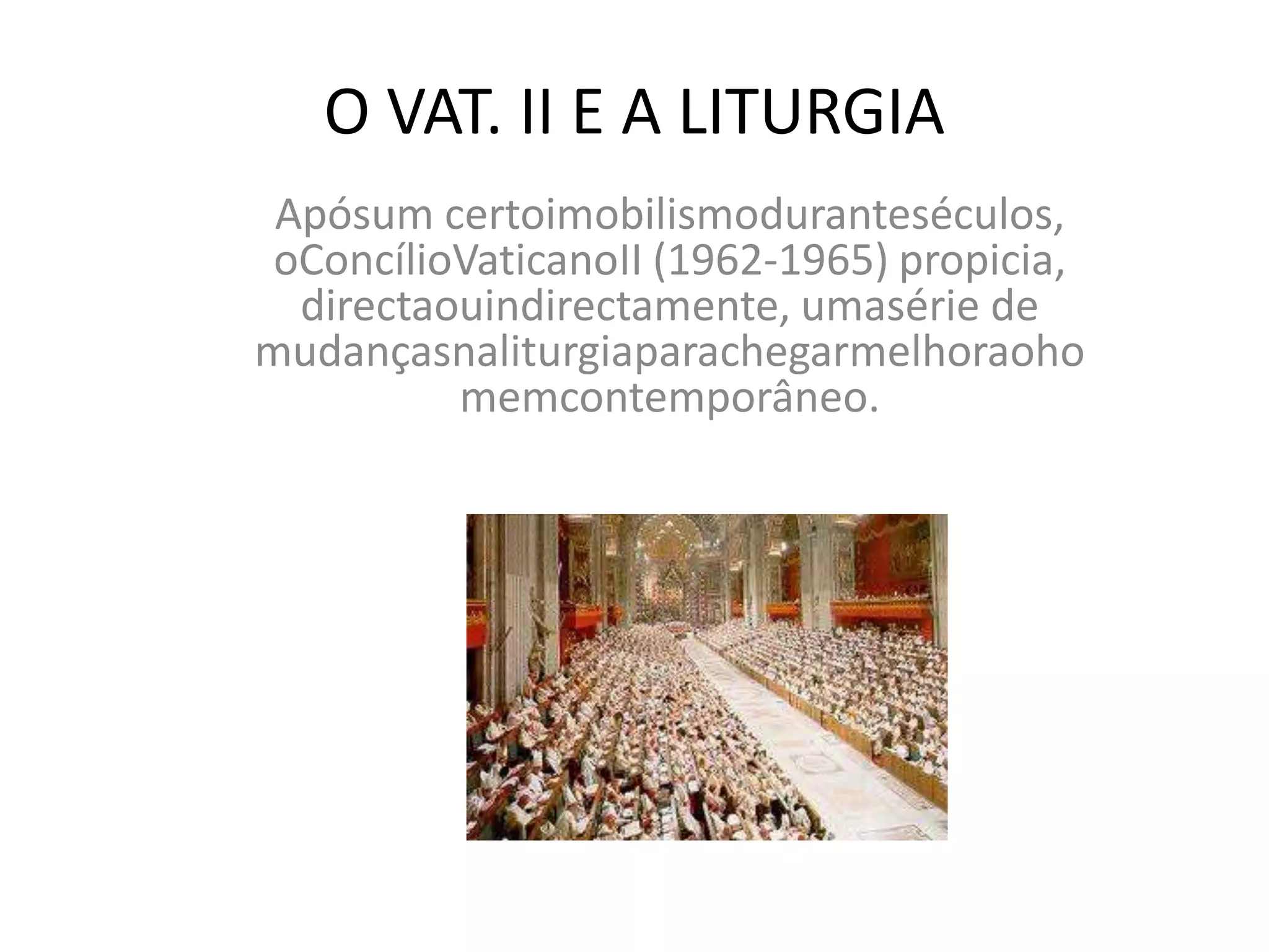 O documento discute como o Concílio Vaticano II (1962-1965) promoveu mudanças na liturgia para se aproximar mais dos fiéis contemporâneos, inscrevendo-se em um movimento litúrgico orientado pelo Papa Pio X no século XX e concluindo temas do Concílio Vaticano I. A Constituição Sacrosanctum Concílium de 1963 codificou essas reformas litúrgicas.