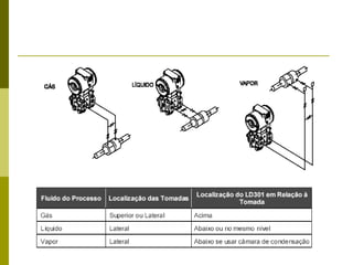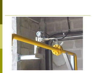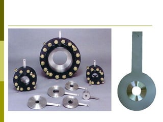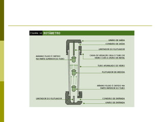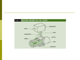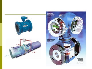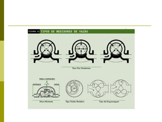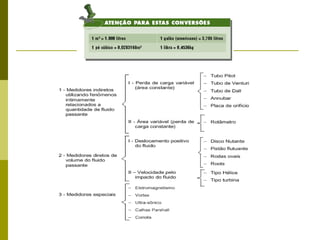 O documento descreve diversos métodos e instrumentos para medição de vazão de líquidos e gases, incluindo: (1) medição volumétrica e mássica, (2) medidores de quantidade e volumétricos, (3) medição por pressão diferencial utilizando placas de orifício, tubos Venturi e tubos Pitot, (4) medidores magnéticos, de turbina, Coriolis e ultrassônicos. Fornece detalhes técnicos sobre o princípio de funcionamento e aplicações de cada método.