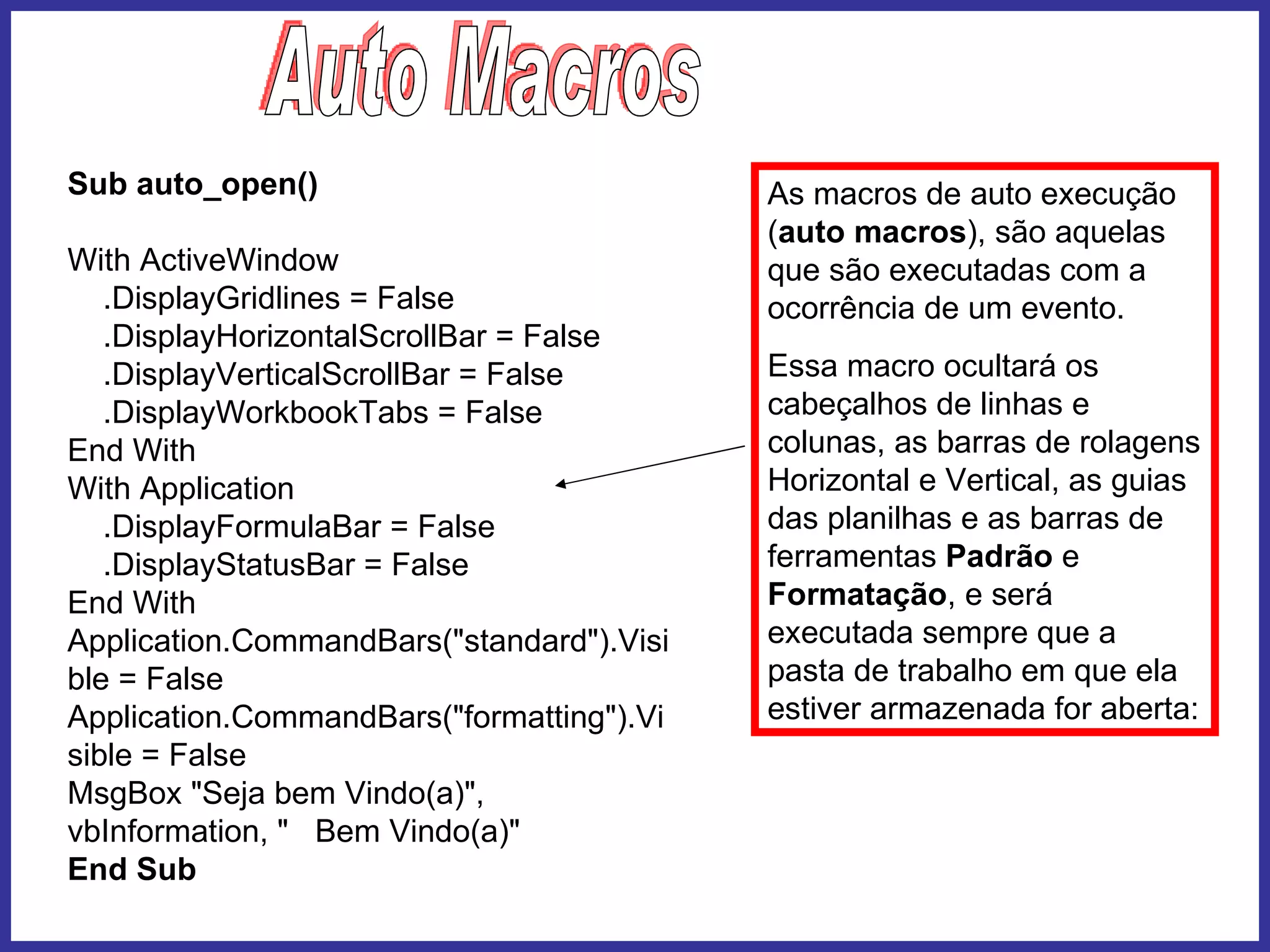 Este documento descreve macros de autoexecução no Excel. A macro Auto_Open oculta elementos da interface como barras de ferramentas e rolagem e exibe uma mensagem de boas-vindas. A macro Auto_Close reexibe os elementos ocultos e exibe uma mensagem de despedida antes do fechamento do arquivo.