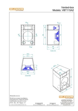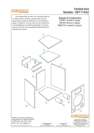 Este documento fornece especificações e detalhes de construção para um alto-falante trapezoidal de duas vias chamado VBT115A2. Ele contém um woofer de 15 polegadas e um driver de titânio para cobrir toda a faixa de áudio. As dimensões, materiais, componentes e frequências de corte são listados.