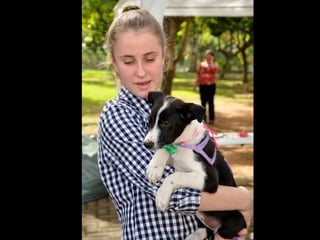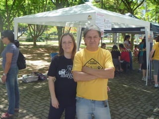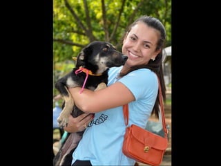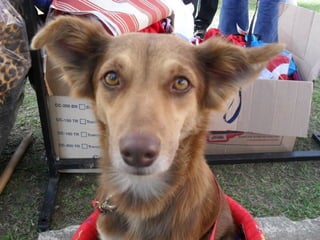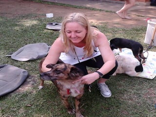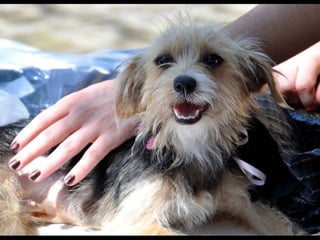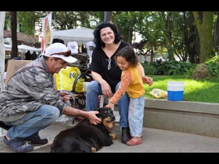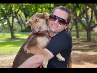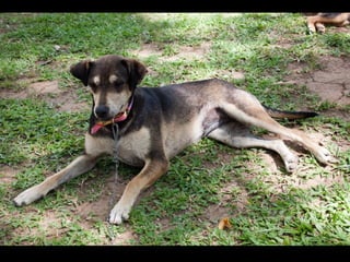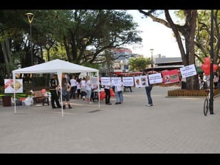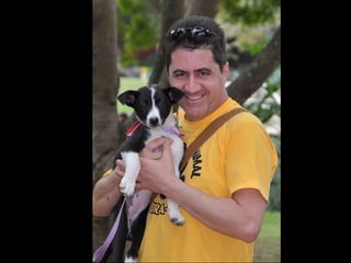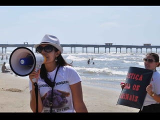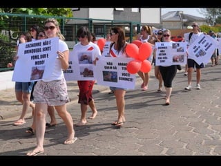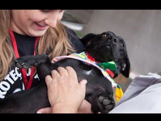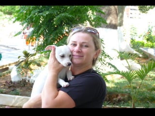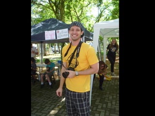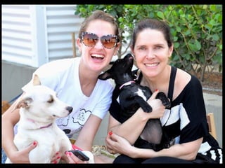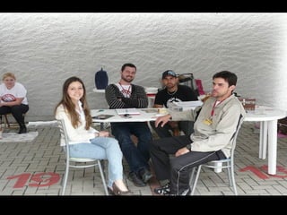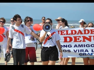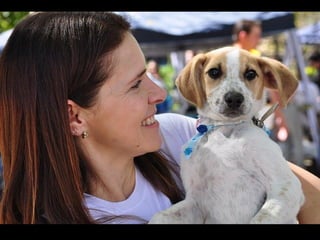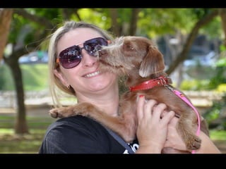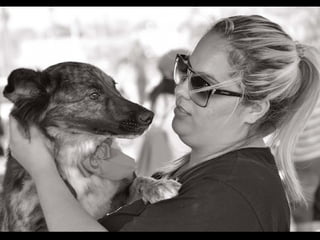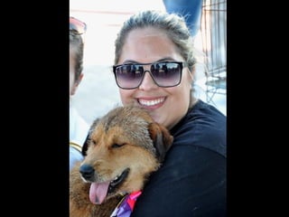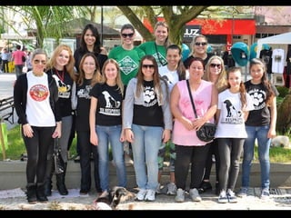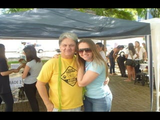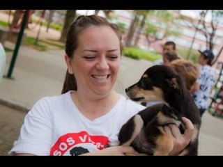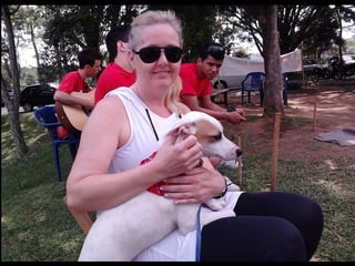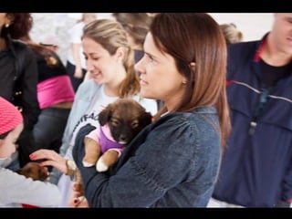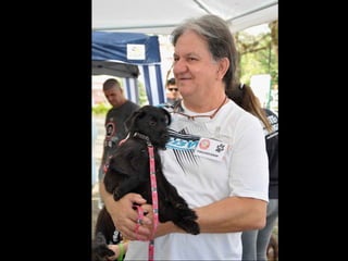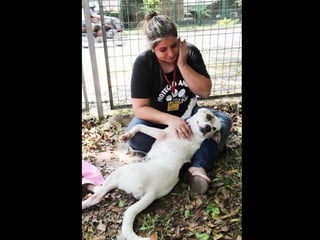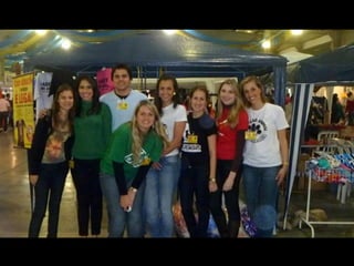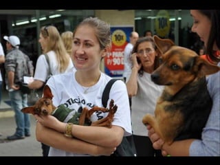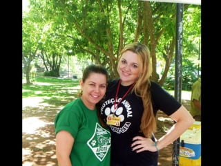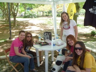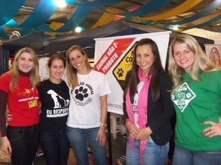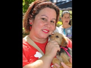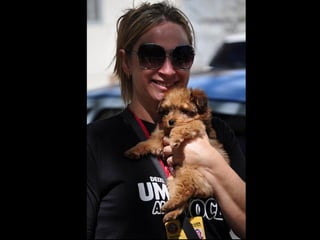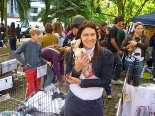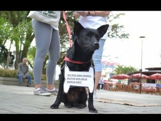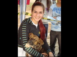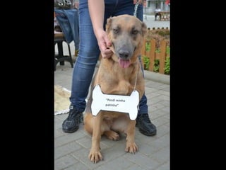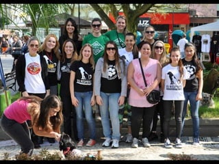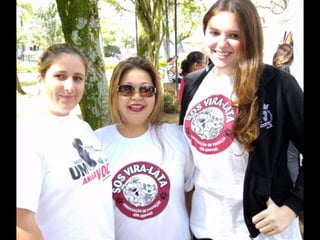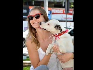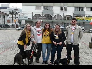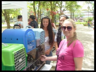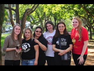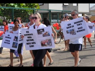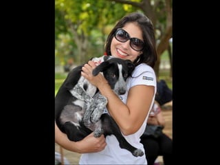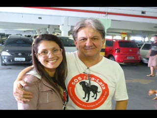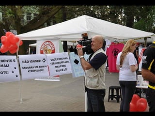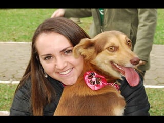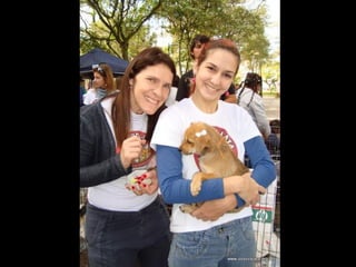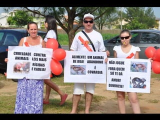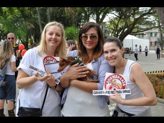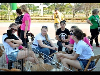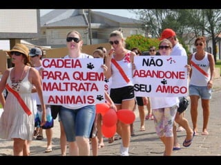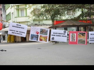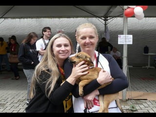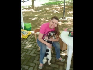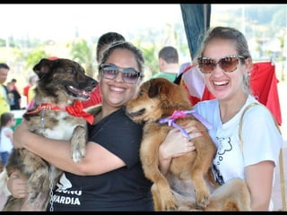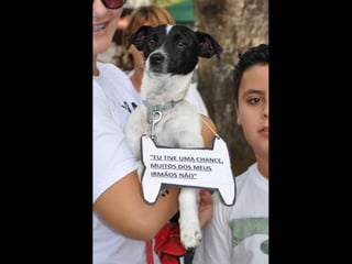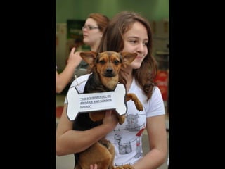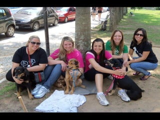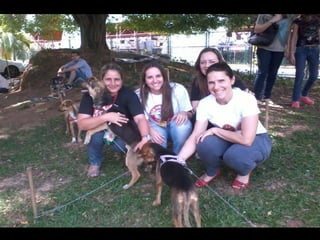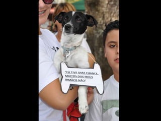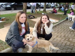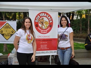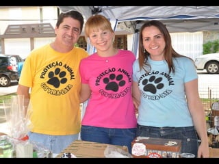 O documento promove um almoço beneficente e agradece aos colaboradores do evento. Ele também apresenta cachorros e gatos à espera de adoção, descrevendo brevemente cada um deles.
