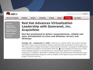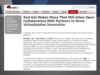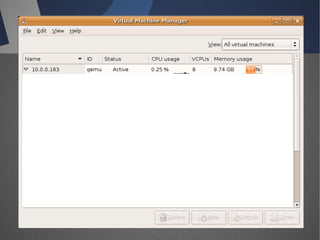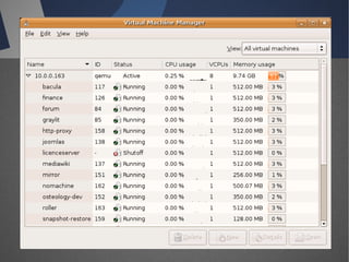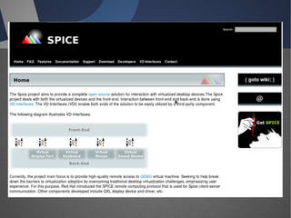 O documento discute a infraestrutura de desktop virtual (VDI) e fornece detalhes sobre o projeto Open Source Desktop Virtualization Technology (OSDVT). O OSDVT visa criar uma estrutura de VDI totalmente de código aberto usando tecnologias como Qemu, libvirt, OpenLDAP e MySQL para gerenciar desktops virtuais.