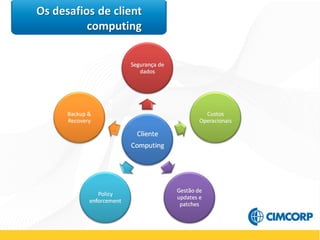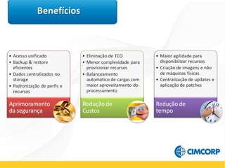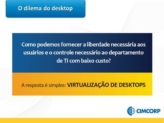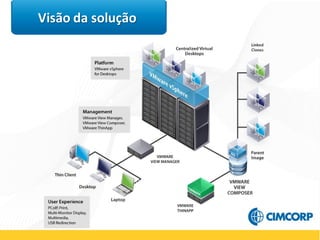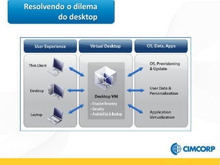 O documento discute a virtualização de desktops como uma solução para uma empresa que precisa renovar 2.000 desktops. A solução proposta envolve a virtualização dos desktops em servidores compartilhados para prover mobilidade segura, gestão única e otimização de recursos, reduzindo os custos em 30% em comparação a uma renovação tradicional. A solução é fornecida como um serviço mensal por ponto.