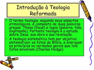 Este documento discute os principais conceitos da teologia reformada, incluindo a doutrina das Escrituras, o princípio da Sola Scriptura e a centralidade da Palavra de Deus. Explica que os reformadores enfatizaram a inspiração, autoridade e suficiência da Bíblia como a única norma suprema para a fé e vida cristã.