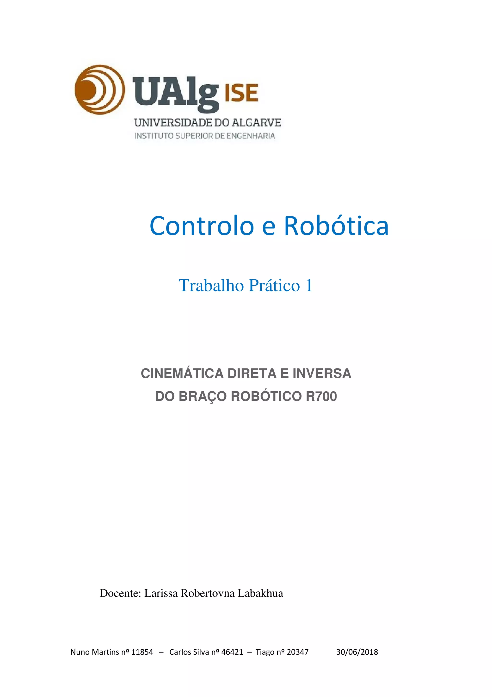 Este documento apresenta um trabalho prático sobre a cinemática direta e inversa de um braço robótico R700. Inicialmente, fornece contexto histórico sobre o desenvolvimento de robôs manipuladores e introduz os conceitos de cinemática direta e inversa. Em seguida, descreve a notação de Denavit-Hartenberg para modelar sistemas articulados e determinar as matrizes de transformação para cinemática direta e inversa do braço robótico.