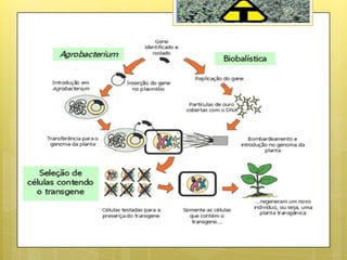 Vegetais transgênicos são organismos que tiveram genes de outro organismo inseridos em seu DNA usando engenharia genética. Eles podem ter genes que conferem resistência a pragas ou herbicidas. Embora possam aumentar a produção e reduzir custos, também há riscos potenciais à saúde humana e ao meio ambiente. O cultivo de vegetais transgênicos cresceu globalmente e no Brasil, onde a soja é a principal cultura transgênica.