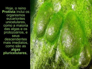 O documento descreve as principais características das três divisões de algas: Clorofitas (algas verdes), Rhodofitas (algas vermelhas) e Feofitas (algas castanhas). As clorofitas são as mais comuns e ancestrais das plantas terrestres, enquanto as rhodofitas são quase todas marinhas e filamentosas. Já as feofitas são todas pluricelulares e marinhas, incluindo as maiores algas conhecidas.