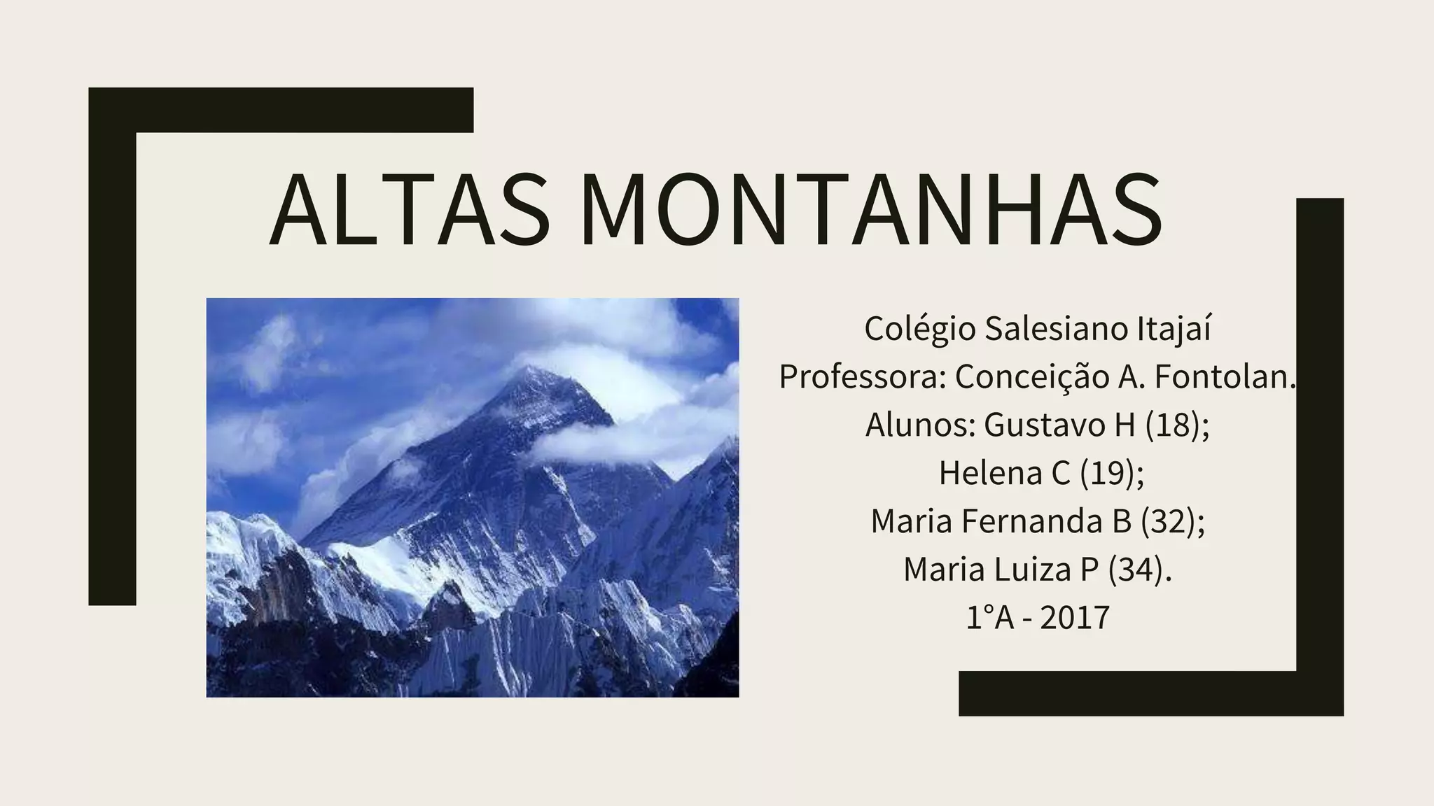 O documento discute as características das altas montanhas, incluindo sua formação geológica, altitudes, clima e vegetação. É dividido em seções sobre o que são montanhas, altas montanhas, zonas de altitude e as 5 maiores montanhas do mundo.