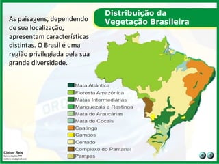 O documento descreve os oito principais tipos de vegetação nativa do Brasil: Floresta Amazônica, Floresta Tropical, Vegetação Litorânea, Campos, Pantanal, Caatinga, Mata de Araucárias e Cerrado. Detalha as características de cada bioma, incluindo clima, solo, altitude e espécies presentes. Alerta que, apesar da exuberância da vegetação brasileira, aproximadamente metade da formação original já foi devastada desde a colonização.