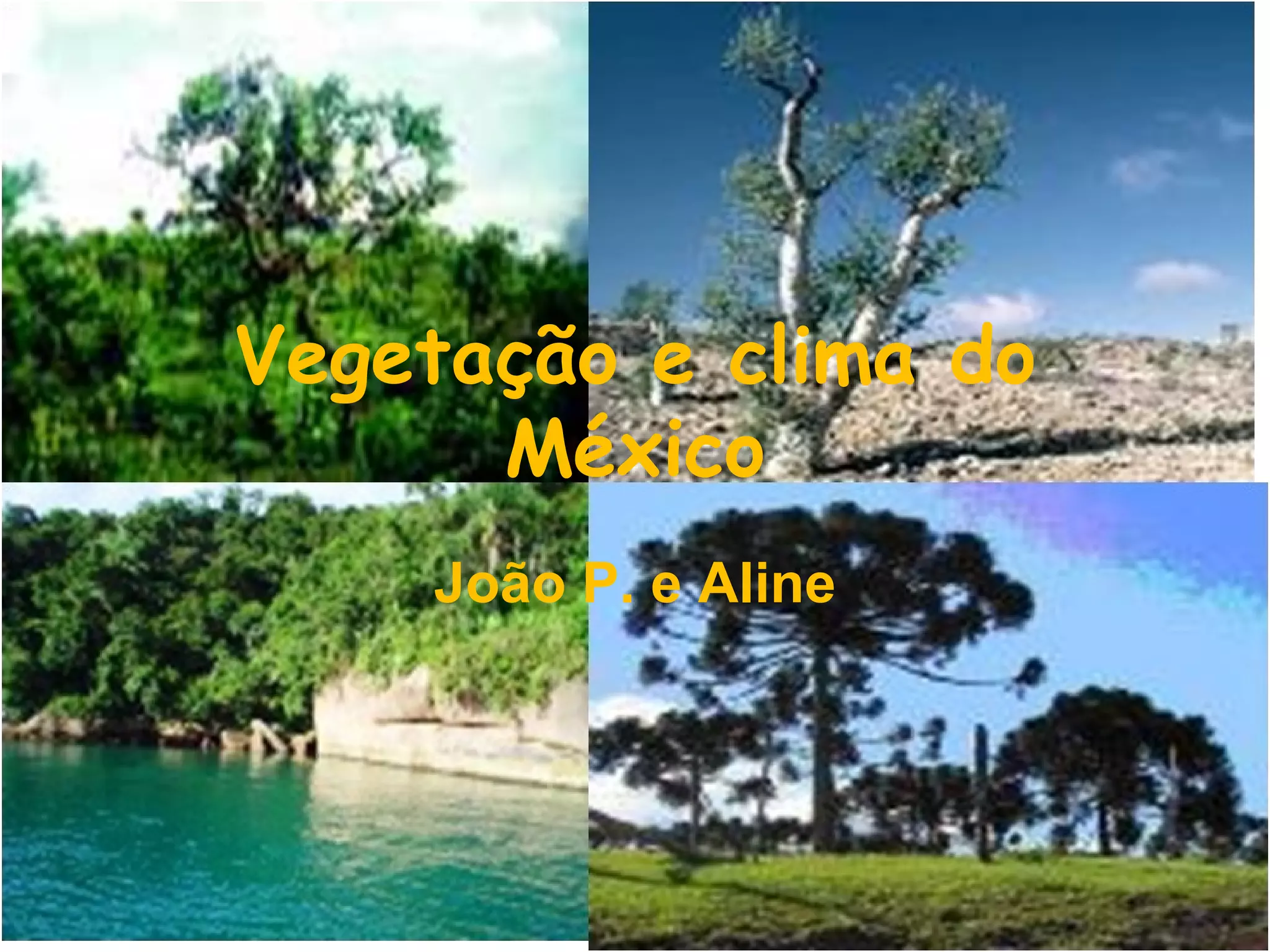 O documento descreve a vegetação e o clima do México, mencionando que ao sul há florestas exuberantes com árvores valiosas, ao norte a vegetação se torna mais escassa e desértica com cactos e gramíneas. O clima é majoritariamente tropical, mas há também clima árido de montanha, sendo que os climas áridos e semi-áridos dominam 60% do país.
