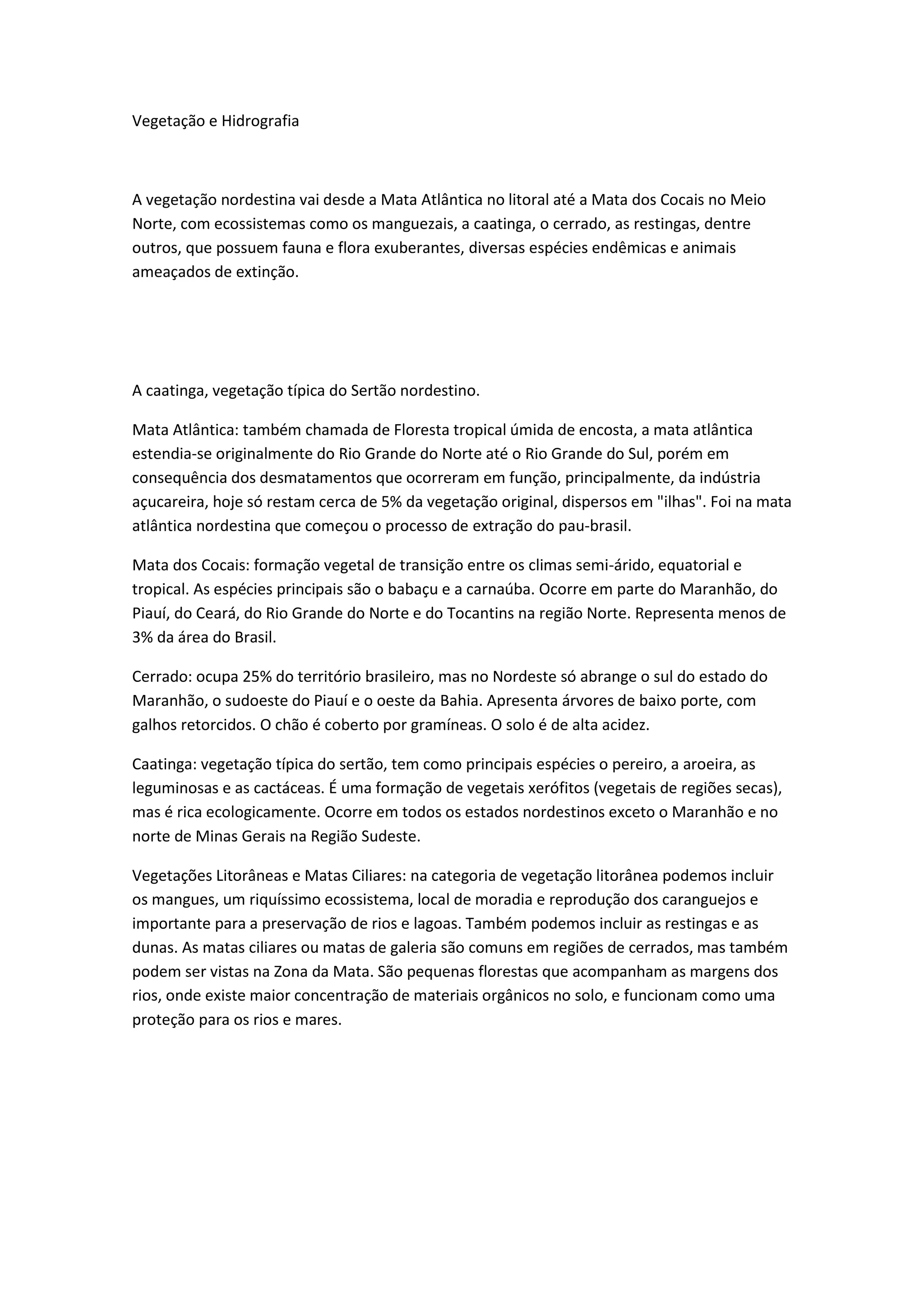 O documento descreve a vegetação e hidrografia da região Nordeste do Brasil. A vegetação varia da Mata Atlântica no litoral até a Mata dos Cocais no norte, incluindo ecossistemas como manguezais, caatinga, cerrado e restingas. As principais bacias hidrográficas são a do São Francisco, Parnaíba e Atlântico Nordeste Oriental e Ocidental.