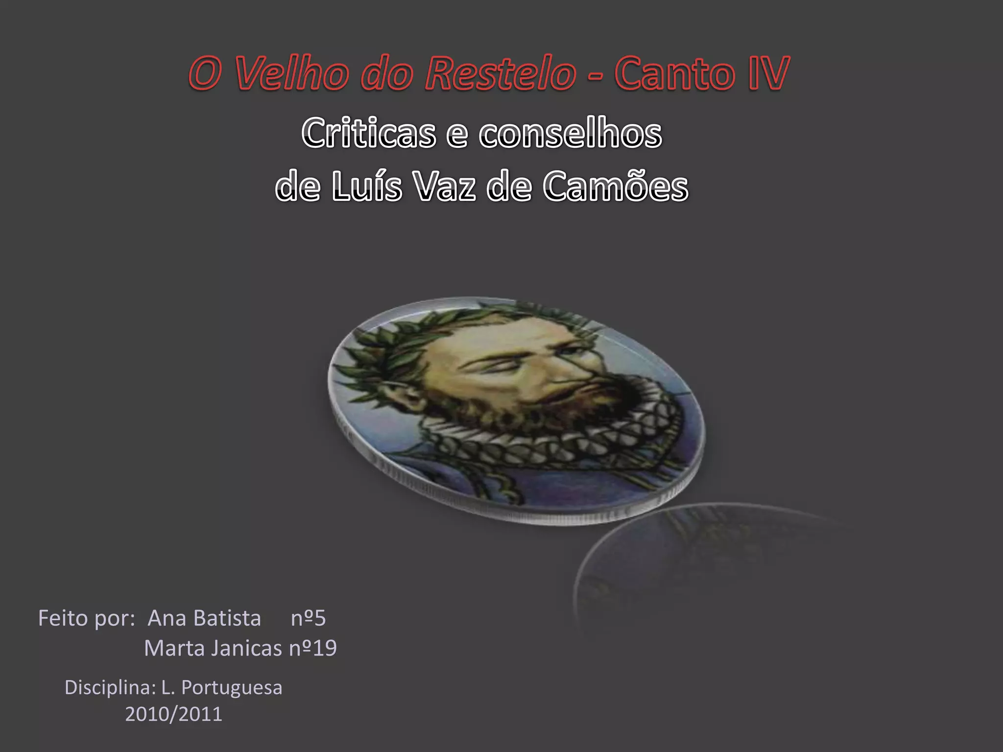 O documento resume o Canto IV dos Lusíadas de Camões, que apresenta o discurso do Velho do Restelo criticando a viagem de Vasco da Gama à Índia. O Velho representa aqueles que se opunham à expedição e aponta os perigos, mortes e sofrimento que trará. Apesar de contrariar o objetivo épico da obra, a inclusão desta voz crítica demonstra a complexidade do pensamento de Camões sobre a empreitada colonial portuguesa.