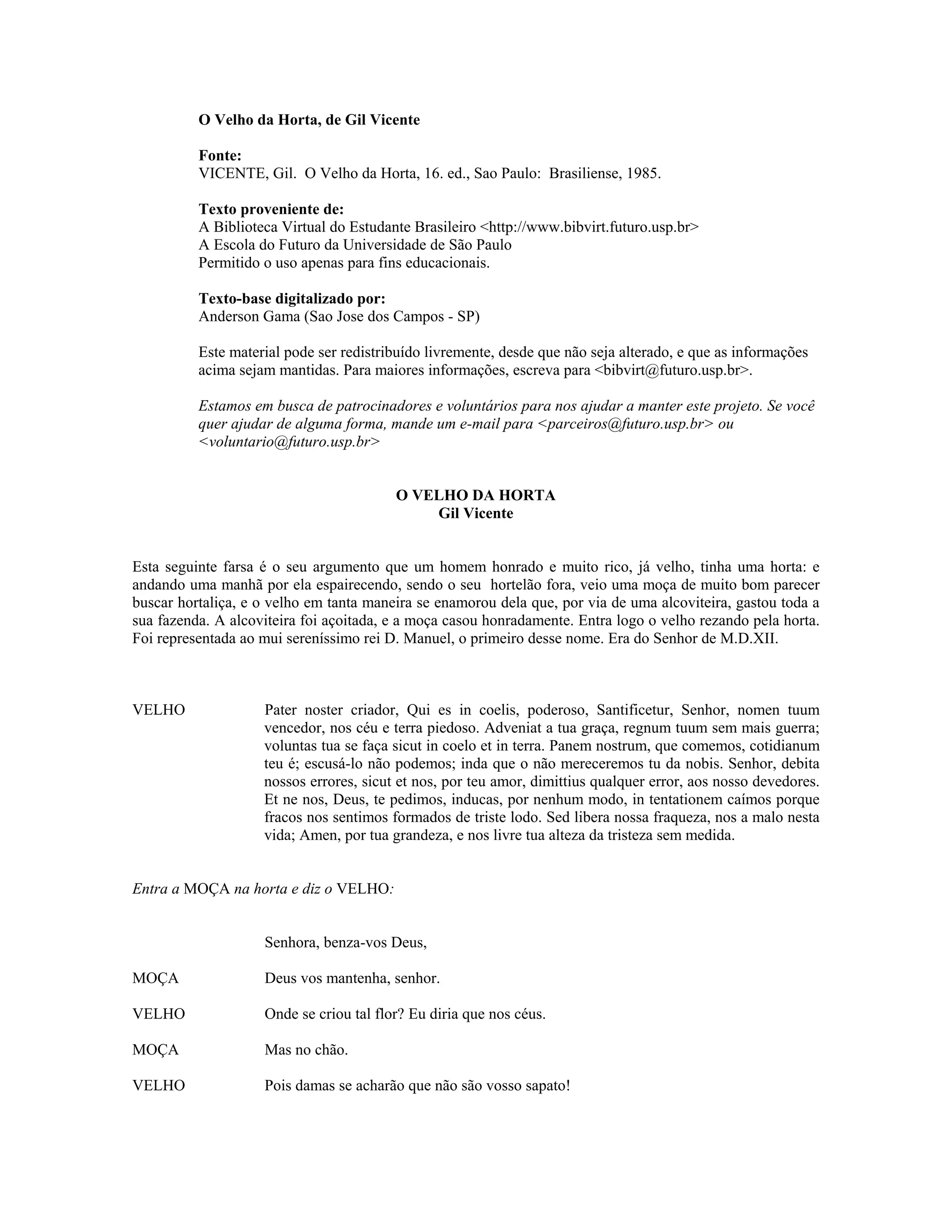 Este resumo descreve a peça teatral "O Velho da Horta", de Gil Vicente: