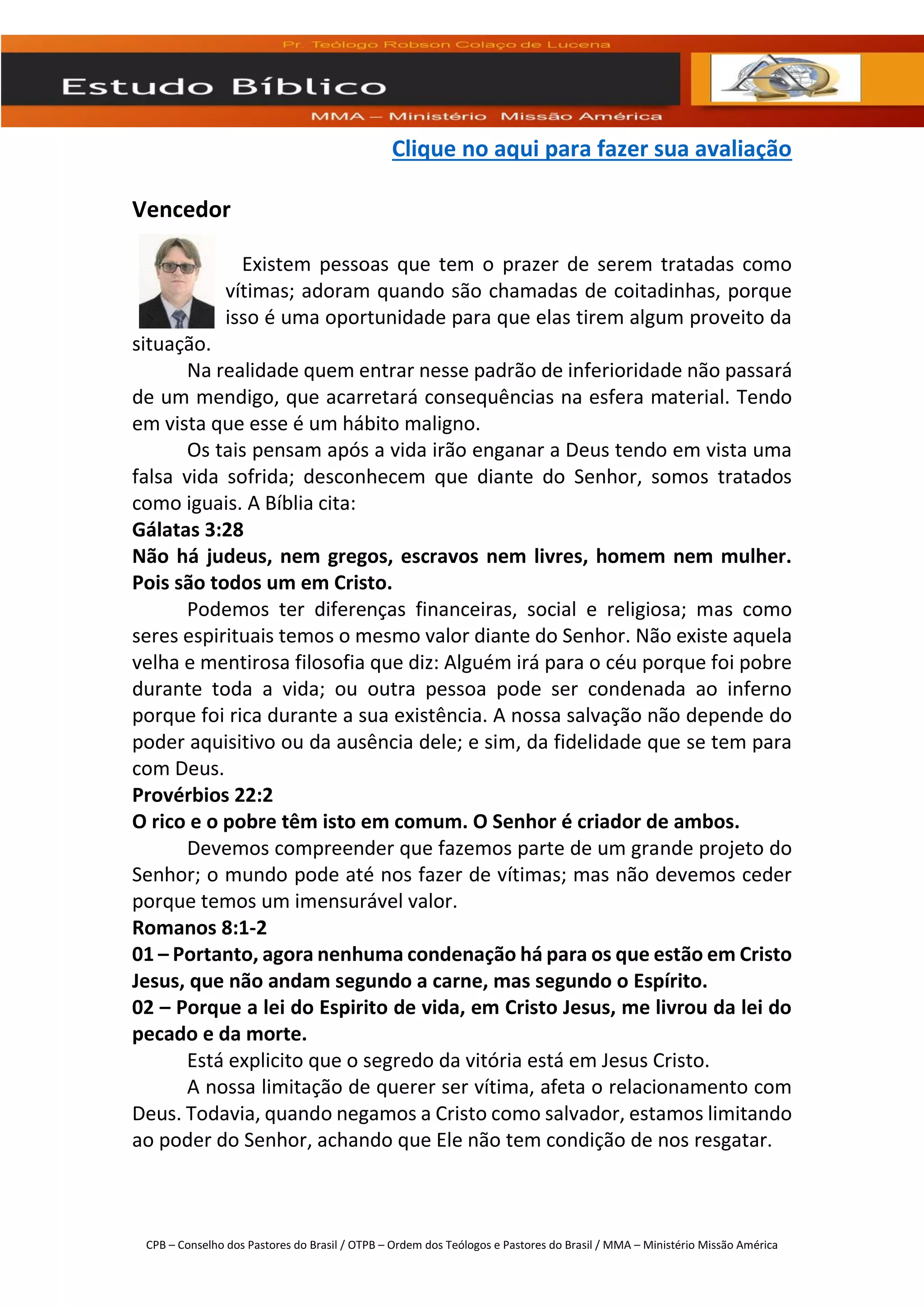 Este documento discute como as pessoas não devem se ver como vítimas, pois isso as limita espiritualmente e materialmente. Embora o mundo possa nos fazer se sentir como vítimas, nós temos valor igual perante Deus independente de riqueza ou status. A salvação depende da fidelidade a Deus, não de circunstâncias materiais. Devemos seguir a vontade de Deus em vez de nos deixarmos influenciar negativamente por outros.