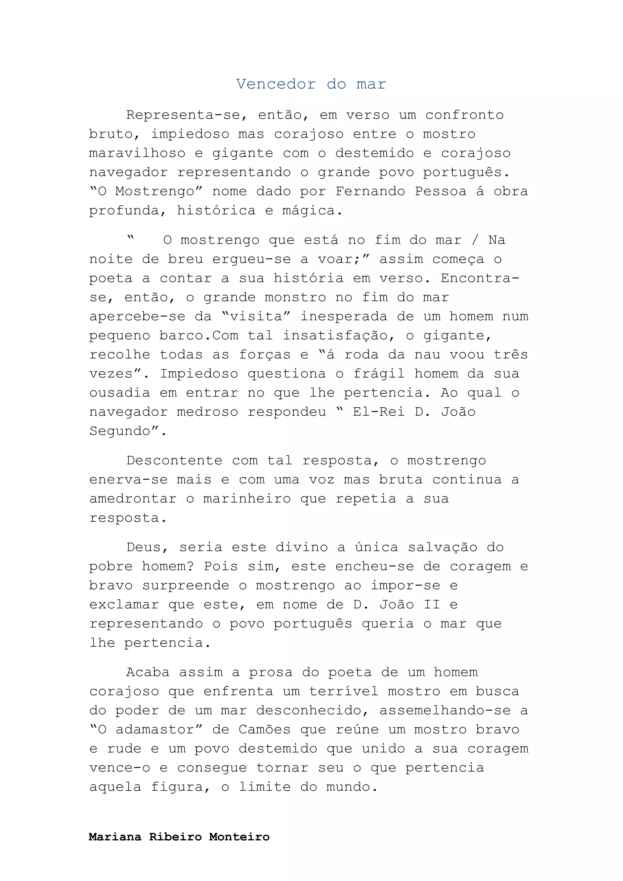 O poema narra o confronto entre um navegador português corajoso e um gigantesco monstro marinho chamado de Mostrengo. O Mostrengo questiona agressivamente a presença do homem em seu território, mas ele responde bravamente que está lá em nome do rei Domingos II de Portugal para reivindicar o mar. No final, o homem enfrenta corajosamente o monstro em busca de expandir o poder português sobre mares desconhecidos.