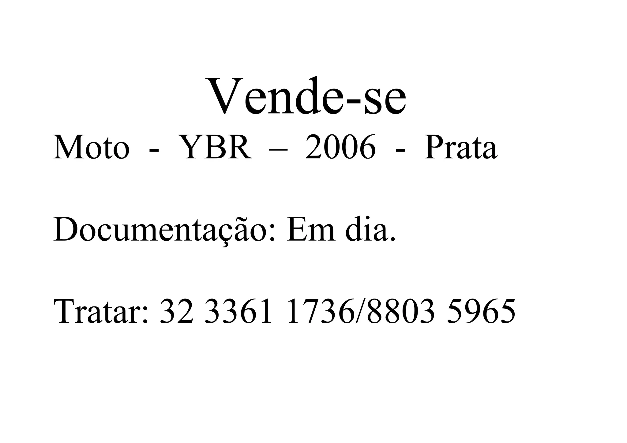 Uma moto Yamaha YBR de 2006 na cor prata está à venda, com documentação em dia. Interessados devem entrar em contato pelos números 32 3361 1736 ou 8803 5965 para tratar da negociação.