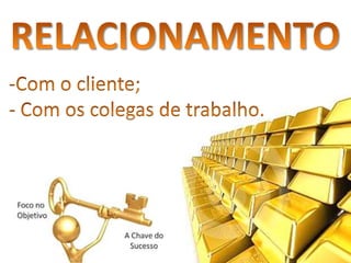 O documento descreve as responsabilidades e metas de um profissional de vendas, incluindo seguir uma rotina de trabalho definida, valores como honrar o cliente, e padrões como negociar apenas após aprovação do orçamento.