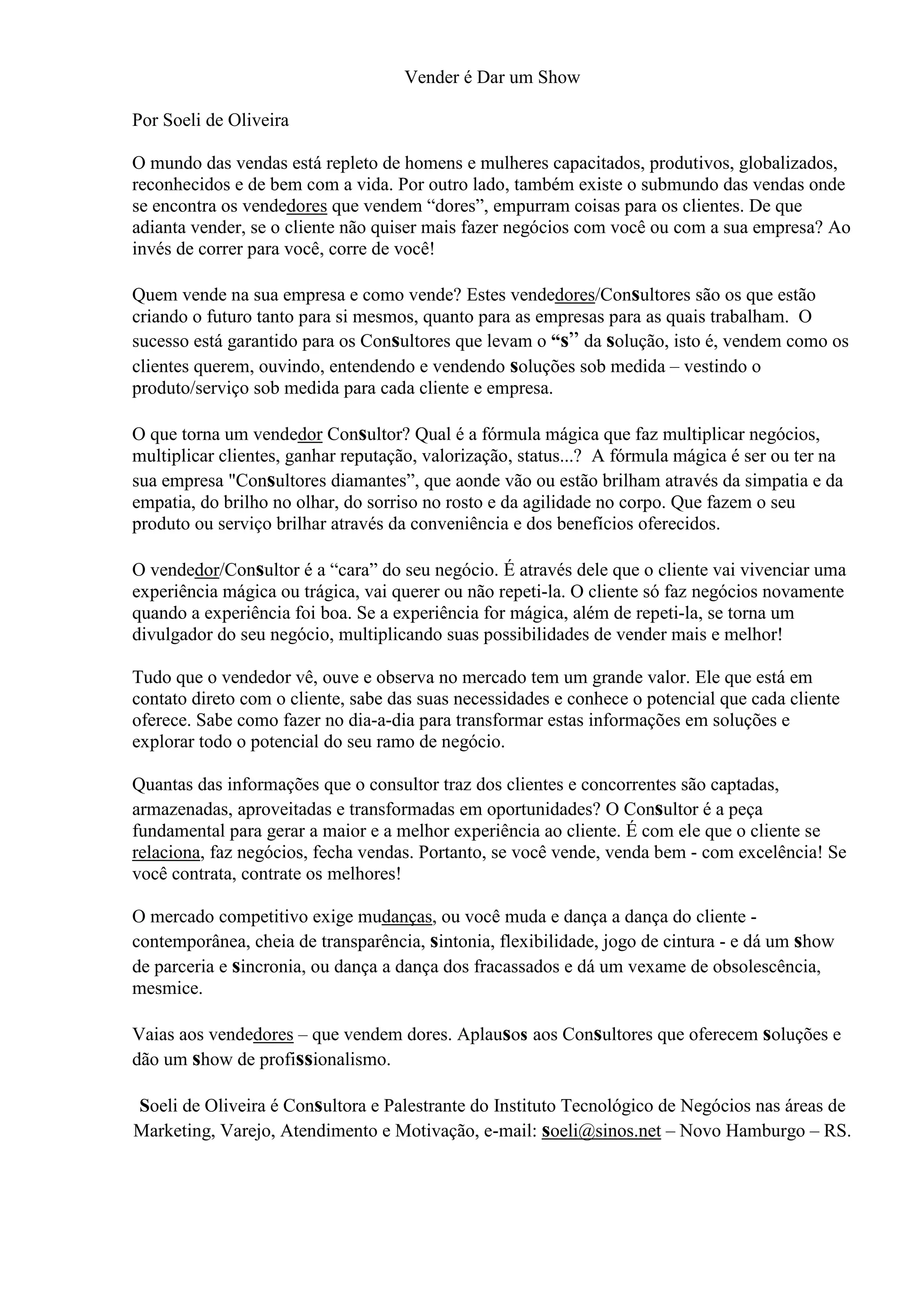 O documento discute a importância de vender como um "show", atendendo às necessidades dos clientes e oferecendo soluções sob medida. Um bom vendedor, ou "Consultor", deve escutar os clientes e vender de forma a proporcionar uma experiência positiva, de modo que os clientes queiram repetir o negócio no futuro. O sucesso depende de transformar as informações coletadas sobre os clientes e o mercado em oportunidades de negócio.